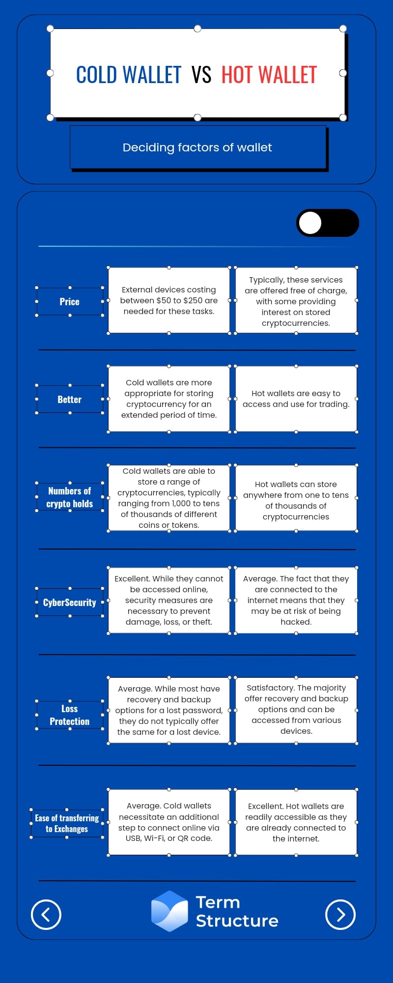 In terms of pricing, hot wallets are more cost-effective as they are typically free, whereas cold wallets can be expensive to purchase.