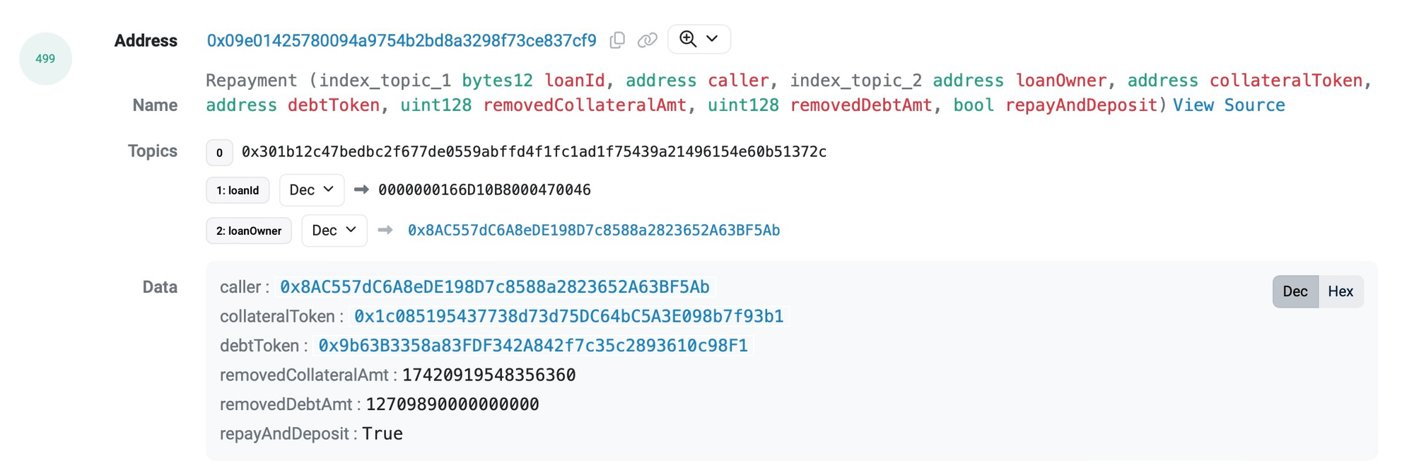 Additionally, this event logs the debt token and transaction amount, although both are in HEX form and require further interpretation.