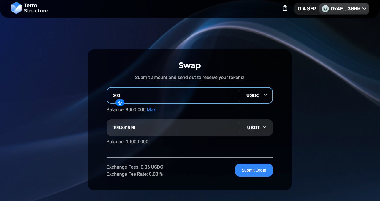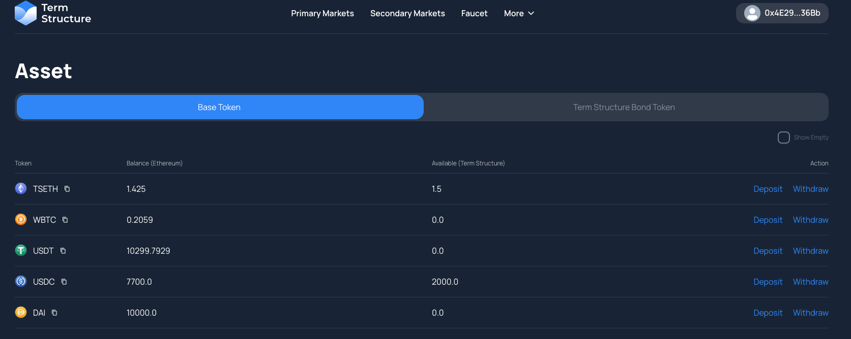 Deposit your test tokens on the Term Structure Testnet once you have received them.
