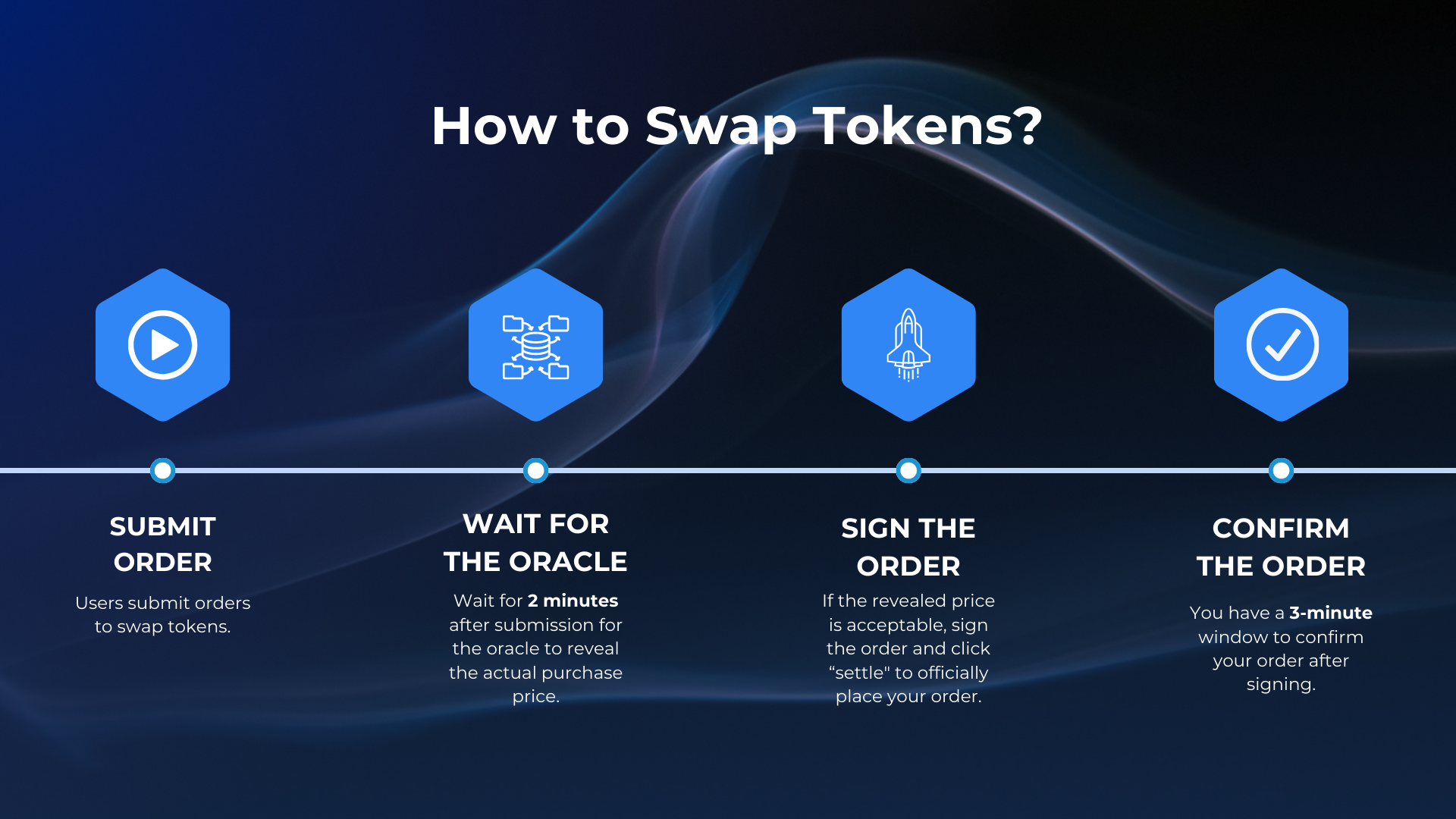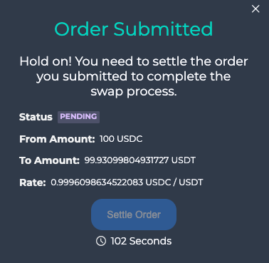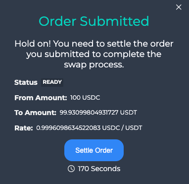 Head to https://swap.testnet.ts.finance/ to swap tokens. We use an internal oracle to provide the prices of different tokens. Keep in mind that the price shown on the website is for reference only and may change due to market volatility. To prevent frontrunning, submit your order and wait for 2 minutes for the oracle to reveal the purchase price. If the price is acceptable, sign the order and click "Settle" to successfully place the order. Please note that you have 3 minutes to confirm the order.