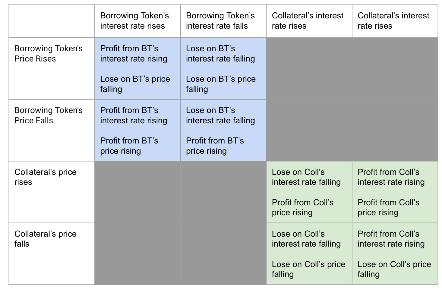 An increase in the interest rate of the borrowed token after the borrower has taken out the loan is also advantageous because it means the borrower has secured the loan at a relatively lower interest rate. Additionally, a decrease in the interest rate of the collateral currency benefits the borrower, especially if the collateral token could have been lent out to earn interest.