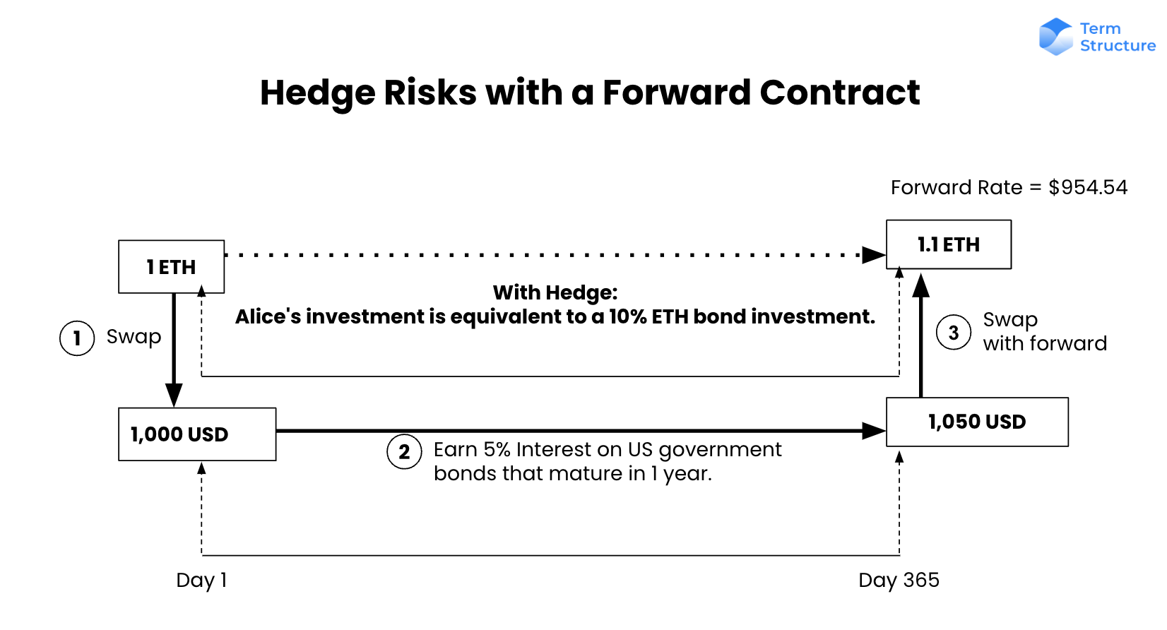 Let's break it down for better understanding. Imagine Alice has 1 ETH and wants to earn more by making low-risk investments. Instead of lending the ETH at a variable rate, she decides to swap it for $1,000, the hypothetical value of 1 ETH measured in US dollars. Then, she invests in US government bonds with a risk-free rate of 5% and a maturity date of 1 year. After 1 year, she will receive $1,050 (initial investment of $1,000 plus 5% interest). To hedge against ETH price fluctuations, Alice enters into a forward contract. (If you don’t know what a forward contract is, here is the article.) If the term structure of interest rates for a 12-month ETH bond token on the Term Structure Protocol is 10%, the forward price is around $954.54 (calculated as $1,050 divided by (1+0.1)). This ensures that Alice can use $1,050 to buy exactly 1.1 ETH one year from now despite the price fluctuations of ETH.